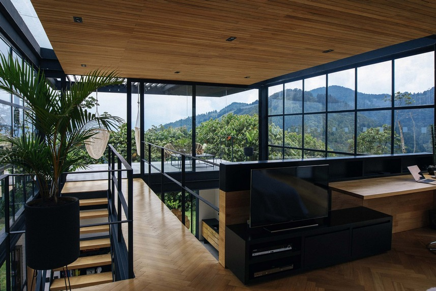 穿過*空隙的小型金屬結(jié)構(gòu)橋?qū)⑴P室與一個(gè)帶頂棚的露臺(tái)連接起來,露臺(tái)占據(jù)了周圍的自然景觀。